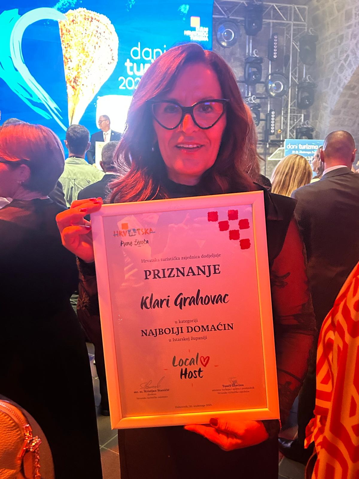 Klara Grahovac prepoznata je kao kreatorica osobnog i autentičnog pristupa u obiteljskom smještaju te je prva dobitnica nagrade “Najbolji domaćin godine – Local Host” Istarske županije. Ovo priznanje dodjeljuje se onima koji goste ne doživljavaju kao prolaznike, već kao ljude koje se dočekuje s pažnjom, toplinom i iskrenim odnosom. Za nju je biti Local Host svakodnevna praksa – osobni doček, direktna komunikacija i briga za detalje koji boravak pretvaraju u iskustvo.